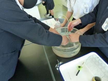 子どもたちは実験で、炭酸水をふったときに出てくる泡を水の中で試験管に集めています。ここで、炭酸水から出てきた気体の正体が「酸素」か「二酸化炭素」なのかということをこの後調べていくことになります。