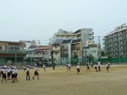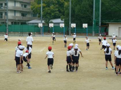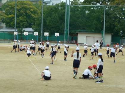 この時間は、高学年のハードル走につながる運動で中学年では走っていてもまたぎ易い低い高さのハードルをおいて行っています。
