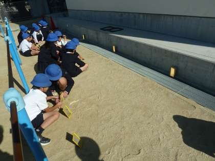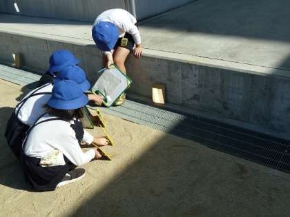 鏡で日光を跳ね返して1枚だけの時と3つの日光を重ねたときとで違いがあるかどうか調べていました。