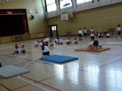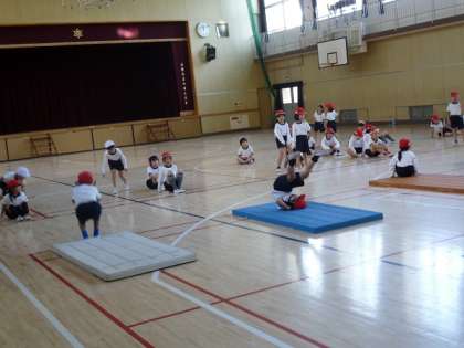 この時間はマットの上で前に転がったり、後ろに転がったりする運動を楽しんでいました。手のつき方や安全に運動するためのコツなどを先生から聞いて行っていました。