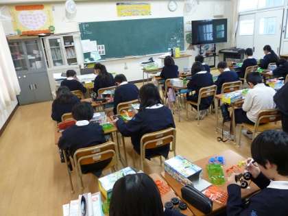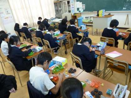 これから学習を進めていくときに使う実験キットの部品一つ一つに番号を書き入れていました。細かい部品も多く、部品が落ちていたりしたときに誰のものかわかれば持ち主に渡すことができます。子どもたちは番号を書き入れている間、全員が私語もなく集中して取り組んでいました。