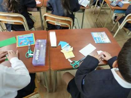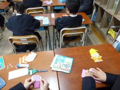 1年生の子どもたちが折り紙を使って雪だるまやサンタクロースを作っていました。