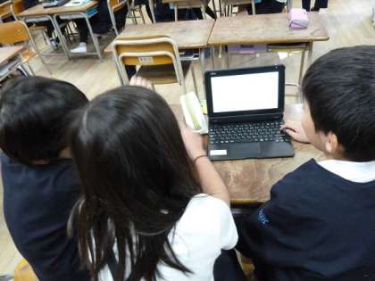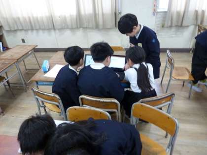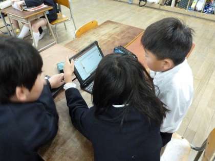 3年生のこちらの学級でも、グループごとに調べたことをタブレットを使って、発表用のシートを作っていました。