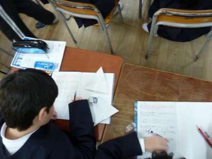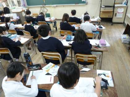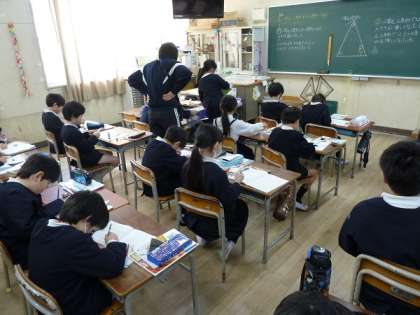 子どもたちは一人一人に2つの三角形が配られていて、角の大きさを自分で測り、分かったことをノートに書いていました。