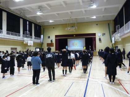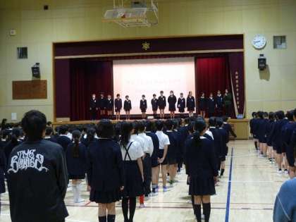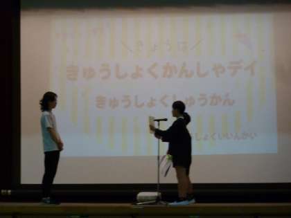 今日の集会は、給食感謝デーとして、いつも給食を作っていただいている給食調理員さんへ感謝のメッセージを児童代表から手渡しました。