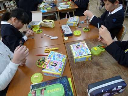 その後、穴のあいた丸磁石を鉛筆に通して、磁石と磁石が浮いているようにするにはどうすればよいか試しながら行っていました。