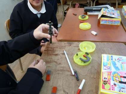 磁石にはN極とS極があることを知り、磁石を近づけて見てS極とN極の関係を調べていました。