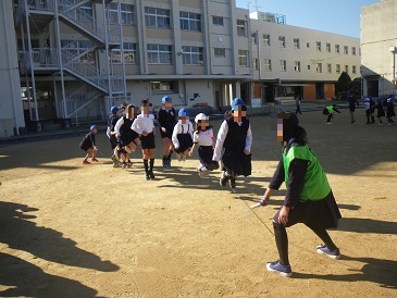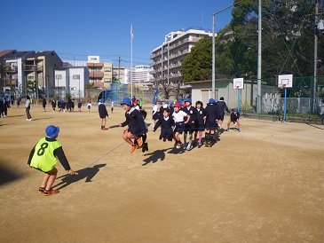 2分間の間にどれだけ多くの回数跳べるのかを競います。跳んだ人数が各班ばらばらなので、(跳んだ人数)×(跳んだ回数)で競います。さて、どの班のポイントが多かったのでしょうか。結果は来週の児童集会でわかります。