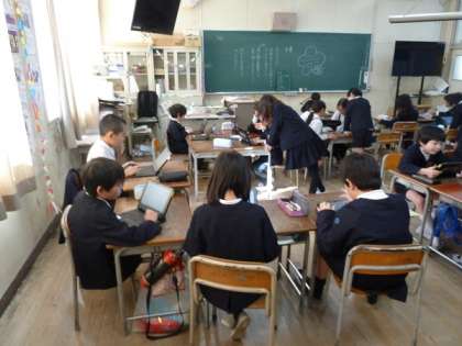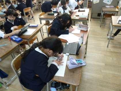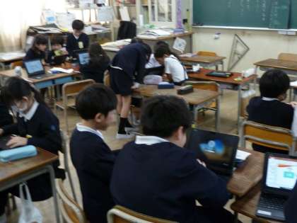 3年生は先日の社会見学で訪れたくらしの今昔館でいろいろ学んだことをもとに、いろいろな道具について、グループで調べ、発表に向けてのプレゼンテーションづくりをしているところでした。