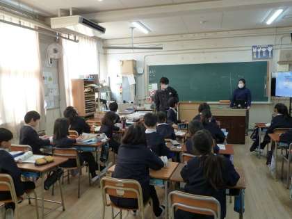 先生がジェスチャーしたのを見て、英語で答える活動です。結構たくさんのパターンがあって、何度も繰り返しながらジェスチャーと英語での言い方を当てはめて行っていました。