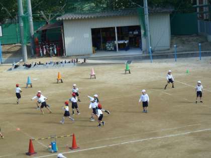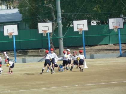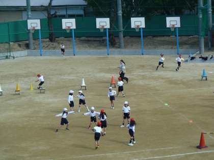 ボールを使っての運動を行っていました。目の前にいるガード役の人を避けて、ボールを的に当てているようでした。