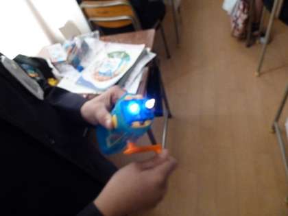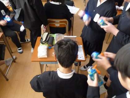 手回し発電機を使って電気を起こし、蓄えた電気で豆電球と発光ダイオードを点灯させていました。