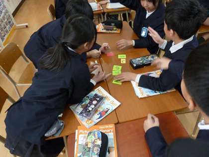 5年生は、自分の町でできることを伝え合おう」ということで、「see」「eat」「play」「enjoy」につながるものを考えていました。