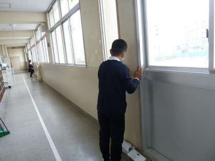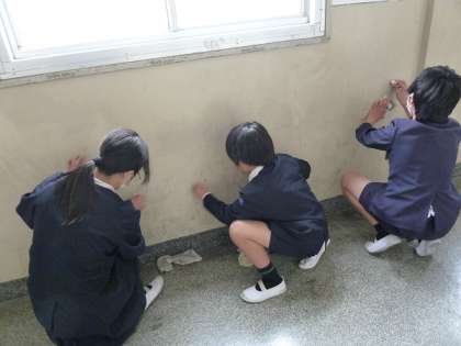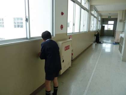 6年生の人たちが学校をきれいにという思いを込めて、廊下の壁を手分けして拭く活動をしていました。