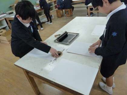 5年生はリコーダーを吹いている姿を彫刻刀で彫り、この時間はインクをつけて用紙にうつす活動をしていました。