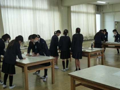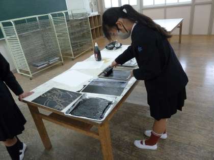 ローラーでインクを板にしっかりと馴染ませ、板の上に用紙をおいてバレンでよくこすって、紙を離せば、白黒で表した作品の出来上がりです。紙にうまく刷り上がった作品を見たときは感嘆の声がでていました。