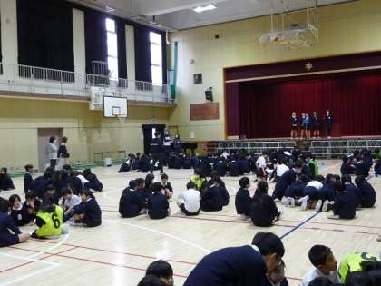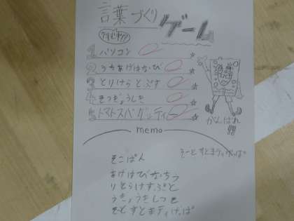 集会委員会の児童が言葉を一文字ずつランダムに言い、その言葉を並び替えて完成させるというものでした。簡単な4文字では、「そこぱん」→パソコン、その他「あげはびなちう」→「うちあげはなび」のように文字数が多くなると難しさが高くなっていました。