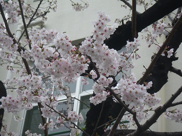 小雨が降ったり、やんだりですが、校庭の桜がきれいに咲いています。
