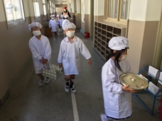 その後5年生の教室を見てみると、給食当番が盛り付け、どんどんみんなの机へ給食が用意されています。さすが高学年はちがうな、と感じられました。
