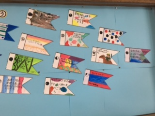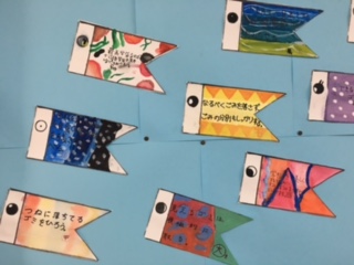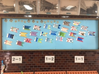 玄関に青空が広がり、たくさんのこいのぼりが泳いでいます。このこいのぼり、元気に泳いでいるだけではありません。青空のように学校を美しよう、という目標のために、自分でできることが書かれています。ぜひこの小さな目標を実行し、そして大きな成長へとつながっていってほしいです。