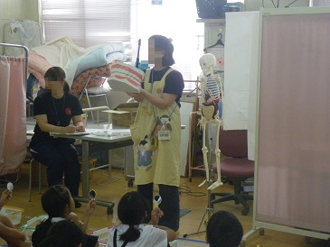 さらに、今年度より保健調査票に「整形外科」項目が増えたこともあり、立ったときの姿勢や座ったときの姿勢など、姿勢についての話も行いました。後ろに見える骨の人形はそのためのものです。
