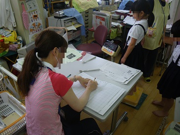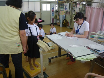 体重測定に合わせて、歯みがき指導や姿勢についての指導も行いました。また、自分の生活を振り返るようにも声かけしています。「昨日は何時に寝たかな?」「朝ごはん食べてきたかな?」基本的な生活習慣は、学習にも影響してきます。普段から声かけしていただいているとは思いますが、子どもたち自身でもふりかえっていますので、お家でも見直してみるいい機会ではないでしょうか。
