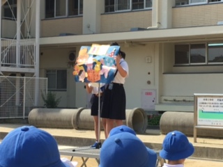 児童朝会では、図書委員会から読書週間についてのお知らせがありました。読書週間は図書委員会の子どもたちが中心となり、朝の放送や図書室の管理なども行います。