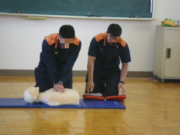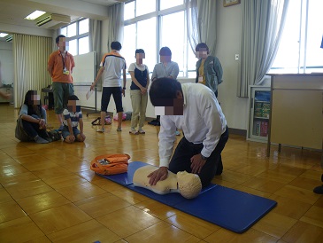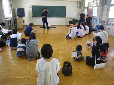 6月半ばより、プール学習が始まります。中本小学校では毎年、プール学習に備え、東成消防署の消防士に来ていただき、救急救命講習を行っています。今年は、保護者の方にも参加いただき、心肺蘇生やAEDの使用についてなど、いっしょに講習を受けました。