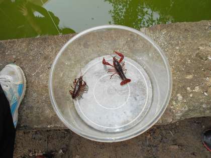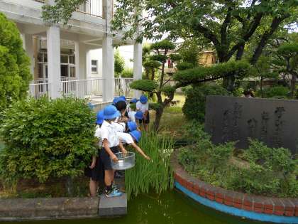 生き物の観察をするため、校内の池でザリガニとりをしました。