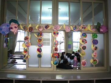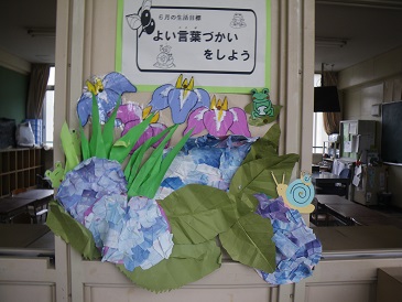 小学校内には、たくさんの花が咲いていますが、廊下にもかわいらしい花が咲いています。かわいらしいかたつむりもいっしょです。学年掲示板にもたくさんの花がさいています。今週末の土曜授業で、ぜひご覧ください。
