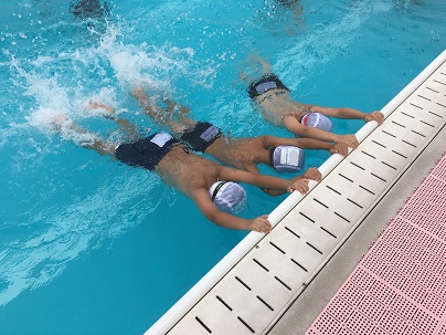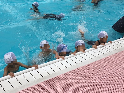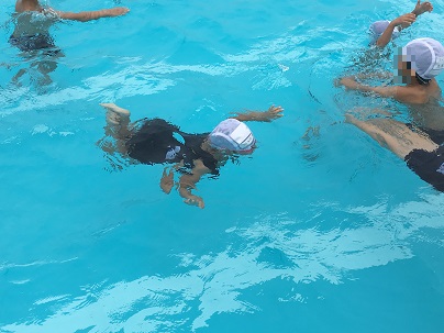 1年生は大きなプールにもだいぶ慣れてきたようです。だるまさんで浮いたり、ふし浮きをしたり、楽しんでいます。2年生は1年生より慣れているので、泳ごうとがんばっています。
