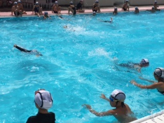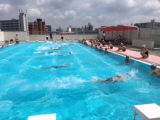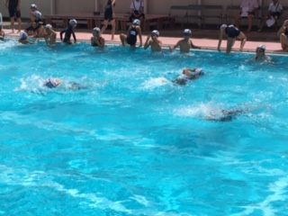 5年生6年生は少しでも多くの時間を泳ぐ時間に使っています。予備日で1時間だけの授業なので、プールサイドの左右に分かれた4人1組が、リレー形式に5分間どんどん泳いでいきます。高学年にもなると、体も大きく、どんどん泳ぐので、競争をしているようで、迫力がありました。