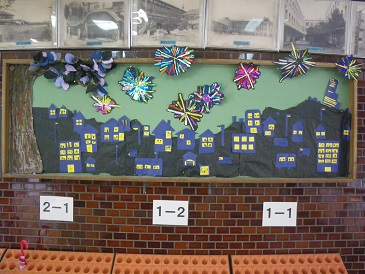 夏の風物詩といえば、たくさんありますが、その中でも「花火」です。玄関にたくさんの花火が打ちあがっています。花火の下には、たくさんの家があかりを灯しています。晩御飯を食べているのでしょうか?テレビを見ているのでしょうか?花火を見ているのでしょうか?