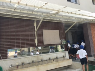 中本小学校には、管理作業員さんがミストシャワーを設置してくれています。児童朝会が終わり、クツを履き替える前に、休み時間が終わり、教室に入る前に、ミストシャワーで少しクールダウンすることができます。子どもたちも手を広げて、喜んで教室へ戻っていきます。