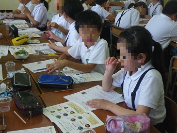 子どもたちは、においのついた紙をグループごとに渡され、オレンジやレモン、ハーブなどのにおいをかぎわけます。これがなかなか難しいです。その後、芳香剤を手作りし、お土産として持って帰りました。