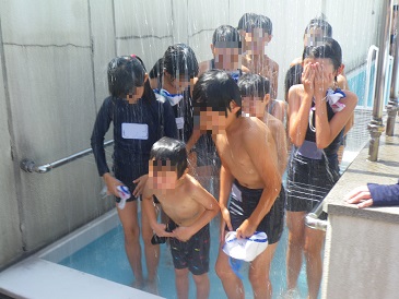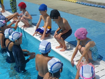 保育所の子どもたちはとても元気いっぱいで、すぐに5年生とも打ち解けていました。プールに上がると、大きなプールに保育所の子どもたちはとてもうれしそうでした。水が少し苦手な子もいると聞いていたのですが、頼もしい5年生のお兄さんお姉さんがいるからか、保育所の子どもたちはどんどんプールの中に入り、5年生とたくさん遊んでいました。