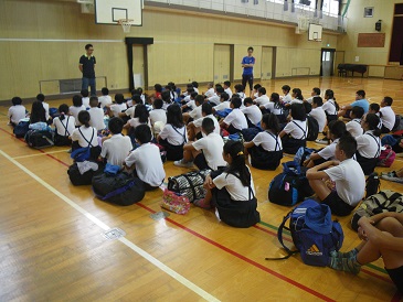 マリンスクール前日に登校日を設けています。5年生6年生の子どもたちが荷物を持って、登校しました。