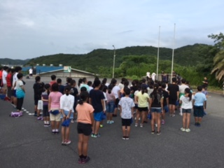 中本小学校も、児童代表が全体の前に立ち、小学校についてと1日の活動の紹介をしました。