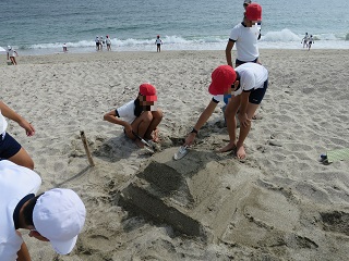 また、海水をくんで砂を湿らせて形作っていったのですが、海の波に打たれながら楽しそうに海水をくんでいました。