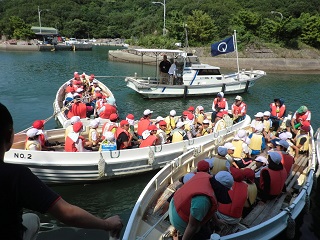 始めは、司令船に引っ張ってもらって、沖に移動しました。小さな波があり、酔いやすい子は少し気持ち悪さがあったようです。しかし、各艇をつないでいるロープを離し、オールを漕ぎ始めると、どの子も酔うこともなく、漕いでいました。