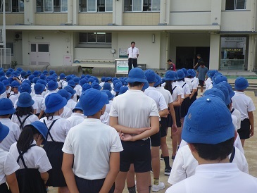 2学期最初の児童朝会です。台風の影響でしょうか、少し蒸し暑い児童朝会になりました。まだ夏休みモードなのか、暑さのせいか、子どもたちは少し体が重たい感じでした。