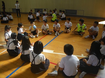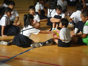 10月最初の児童集会です。今日はばくだんゲームです。各なかよし班(縦割り班)でボールを回していきます。合図をしたときにボールを持っていた子は、円の真ん中で待ちます。次、合図でボールを持っていた子は、真ん中にいること交代します。