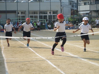 徒競走で走る距離は、1年生より少し伸びます。1年前は初めての運動会にどきどきしていましたが、今年の走る姿は堂々としていました。