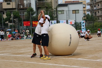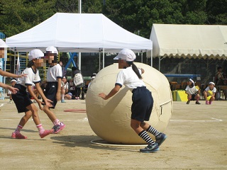 団体競技は大玉ころがしです。コース真ん中でポーズを決めないと、次へ交代できません。急ぎたいけど、止まらないといけない、走る姿とは一転、とてもかわいらしかったです。