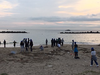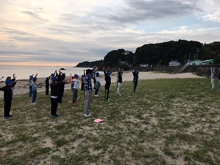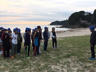 朝の集いです。朝、海で過ごす時間、天気もよく気持ちよさそうです