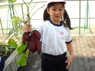 2年生が、芋ほりをしました。このさつまいもは、今まで観察をしたり、雑草抜きをしたり、たくさんお世話をしてきたものです。暖かい天気の中、うれしそうに芋ほりしていました。このさつまいもは、この後学習の中で料理して、食べます。
