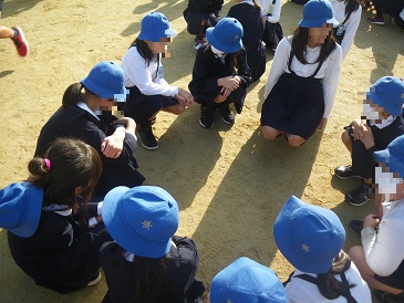 昨日は雨でしたが、今日は気持ちのいい晴れとなりました。今日の児童集会は外で行いました。