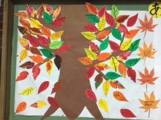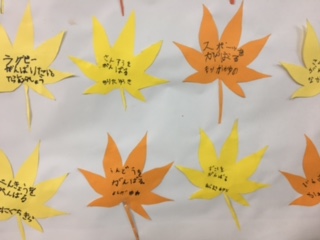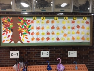 中本小学校の玄関掲示が、秋一色に新しくなっています。たくさんの黄色いイチョウの葉が広がっています。葉っぱ一枚一枚には、1年生の子どもたちの目標が書かれています。