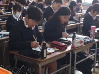 5年生の教室で、子ども達がいるはずなのに、物音一つしません。のぞいてみると、習字の学習でした。