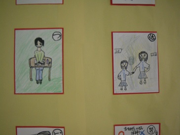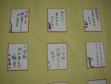 玄関掲示では、5年生の子どもたちが考えたかるたが並んでいます。右側に絵札、左側に読み札が並んでいます。絵も楽しいですが、読み札を読んでいると楽しいです。ぜひ来校の際に、足を止めてご覧いただければ、と思います。